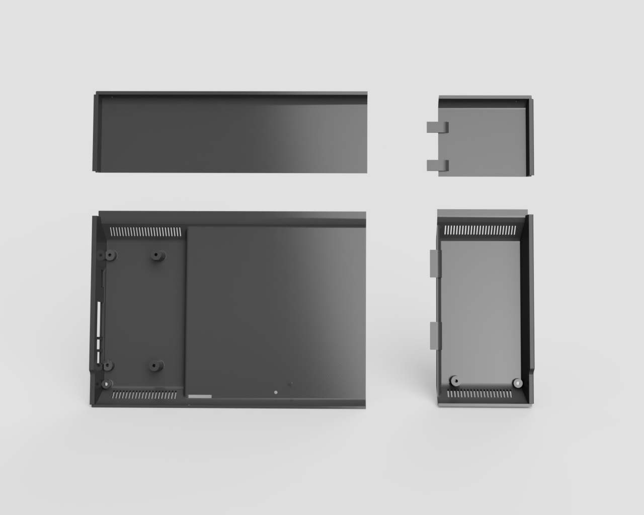 В какой то момент встал вопрос о печати. Габариты корпуса 330х30х250, соответственно целиком детали на печатный стол не поместятся, пришлось разрезать основные части на несколько сборных. Позже сплавлю их с помощью паяльника :D