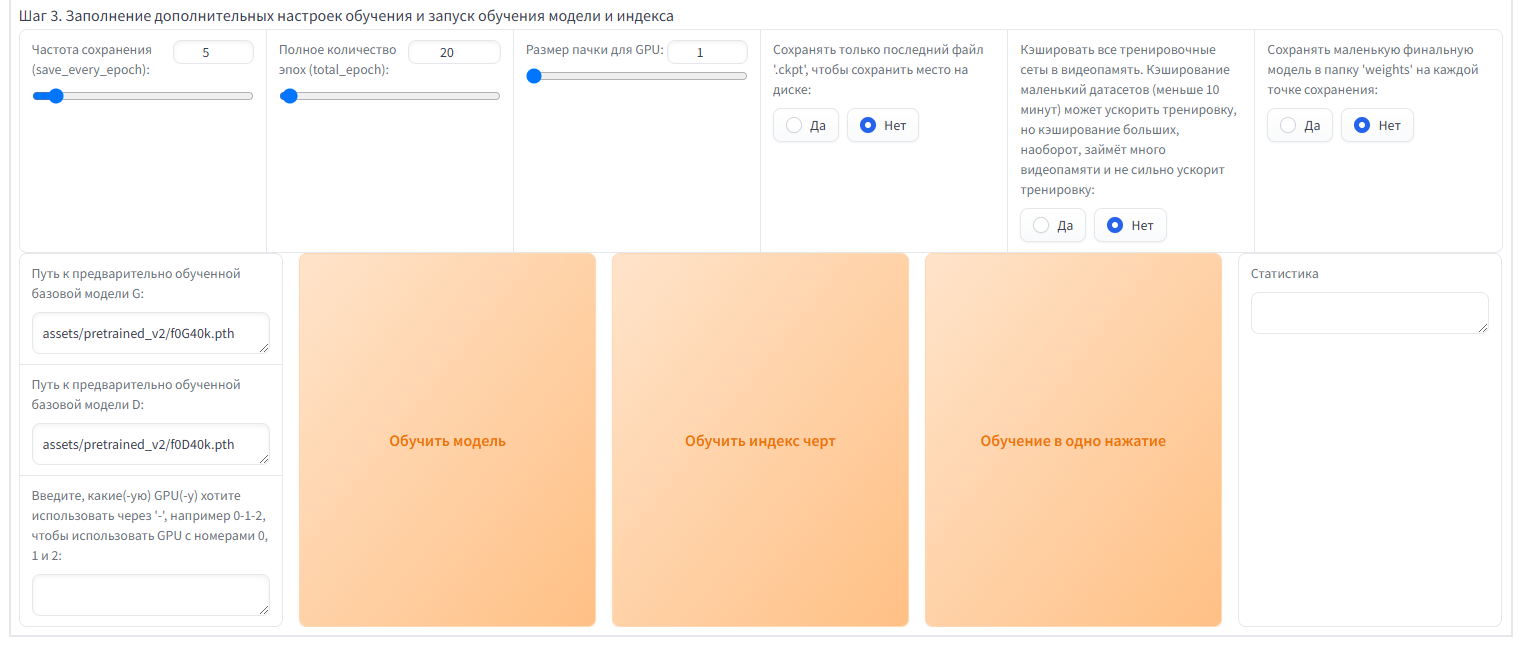 Частота сохранения: Раз во сколько эпох будет сохраняться предобученная модель. Лучше не выбирать слишком частые сохранения, но в случае ошибок, можно будет не запускать весь процесс заново.
