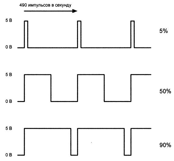 Каждый контакт, работающий в режиме аналогового вывода, генерирует 490 импульсов в секунду (кроме контактов D5 и D6, которые выдают 980 импульсов в секунду). Ширина импульсов, т. е. их длительность, с помощью параметров функции analogWrite() может быть изменена. При этом, чем больше время, в течение которого импульс остается высоким, тем больше мощность, подводимая к выходу, и, следовательно, тем ярче горит светодиод или быстрее вращается двигатель.