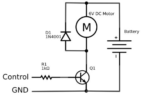 Дело в том, что электродвигатели создают скачки напряжения и всевозможные электрические помехи, которые могут устроить настоящий хаос в такой тонкой электронике, как Raspberry Pi или Arduino. Диод гарантирует, что всплески тока, спровоцированные двигателем, не приведут к мгновенному изменению направления тока, что может сразу сжечь транзистор. Суть в том, что диод пропускает ток только в одном направлении - в этом он похож на обратный клапан. Ток может идти через диод лишь в том направлении, куда указывает сам диод, по своей форме напоминающий стрелку.