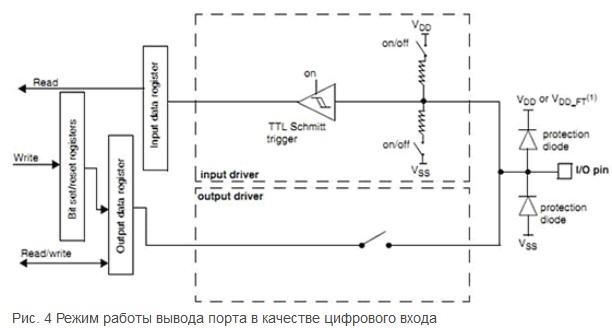 цифровой вход, для непосредственной работы с портом (может иметь верхний (к питанию) и нижний (к общему проводу) подтягивающий резистор) (см. рис. 4);