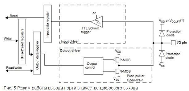 выход в режиме работы альтернативной функции, с открытым стоком (например, выход ШИМ) (см. рис. 6).