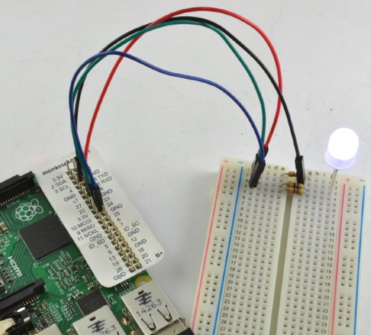 В версии проекта, выполняемой на основе Raspberry Pi, перемычки «папа-папа» заменяются на перемычки «мама-папа», и макетная плата в той же компоновке подключается к контактам GPIO 18, 23 и 24.