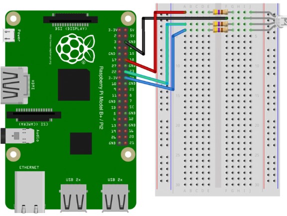 Каждый из трех светодиодов подключен к отдельному выходному контакту на Arduino или Raspberry Pi.