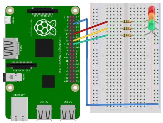 Каждый из трех светодиодов подключен к отдельному выходному контакту на Arduino или Raspberry Pi.