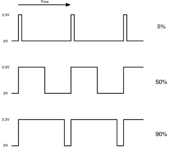 Отношение длительности импульса к периоду его следования называется коэффициентом заполнения. Если импульсы соответствуют включенному состоянию на протяжении лишь 5% всего времени цикла (коэффициент заполнения равен 5%), то на Двигатель будет поступать не слишком много энергии, и он станет вращаться очень медленно (либо светодиод будет светить тускло). Стоит повысить коэффициент заполнения до 50% - и двигатель или светодиод получат половину мощности, соответственно, скорость вращения или яркость составят примерно половину от максимума. Если коэффициент заполнения возрастет до 90%, то двигатель будет вращаться почти с полной скоростью, а светодиод - светить в полную силу.
