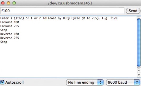 Затем попробуйте ввести команду f255 - двигатель начнет вращаться на полной скорости. Команда s остановит двигатель, команда r100 медленно запустит его в противоположном направлении, а команда r255 разгонит двигатель в обратном направлении на полную скорость.