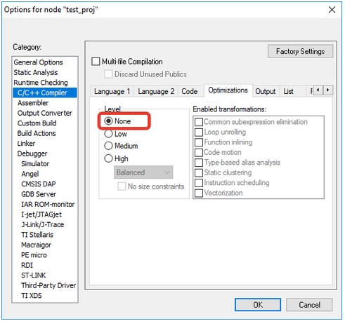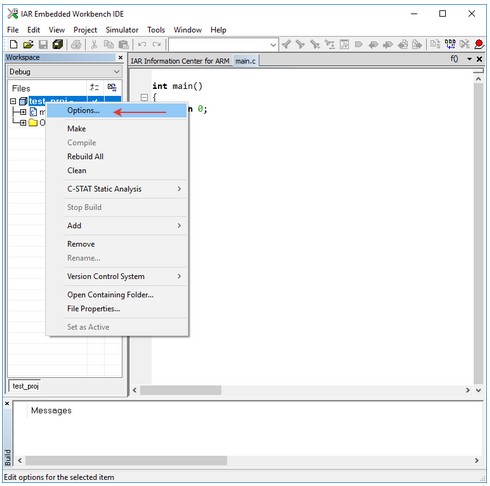 Теперь нам надо настроить проект под конкретный микроконтроллер, а именно STM32F103C8. Нажимаем правой кнопкой мыши на названии нашего проекта и выбираем пункт Options… В разделе General Options на вкладке Target выбираем наш микроконтроллер: Далее настаиваем уровень оптимизации компиляции. При отладке иногда натыкался на некоторые проблемы при высоком уровне оптимизации, поэтому советую в C/C++ Compiler на вкладке Optimizations ставить None или на крайняк Low: Складывать все файлы исходников в корень проекта не очень хорошая идея, в дальнейшем будет трудно ориентироваться среди кучи файлов, поэтому для CMSIS создадим одноименную папку CMSIS . Но нам необходимо указать компилятору путь, где искать исходники. Для этого на вкладке Preprocessor надо указать путь к папке с библиотекой. Чтоб не указывать абсолютные пути, в IAR-е существует переменная $PROJ_DIR$, в которой хранится путь к папке с проектом: