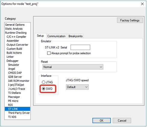 После этого в разделе ST-LINK выбираем тип интерфейса подключения, у нас по SWD: