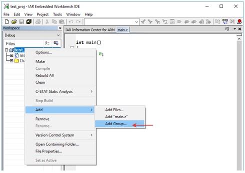 Вот так это должно выглядеть в папке $PROJ_DIR$\CMSIS: Теперь эти файлы надо добавить в обозреватель проекта в IAR-е. Для удобства создадим группу с одноименным названием CMSIS. Нажимаем правой кнопкой мыши на названии проекта и выбираем Add->Add Group… Вводим название группы и нажимаем OK: После этого в группу CMSIS добавляем файлы из папки CMSIS: В открывшемся диалоге выбираем все файлы и нажимаем Открыть: В результате получаем вот это: После этого открываем файл stm32f1xx.h и раскомментируем стоку с #define STM32F103xB: