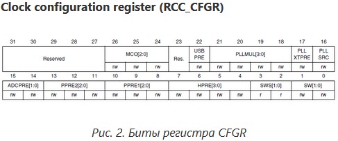 Открываем Reference manual на микроконтроллер STM32F103x8 и переходим к разделу 7: Low-, medium-, high- and XL-density reset and clock control (RCC). RCC имеет довольно много регистров, целых 10 штук. Однако, для настройки источника тактирования и делителей шин нам понадобится только 2 из них. Описание основных битов регистра: