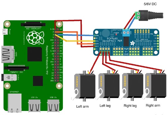 Управляются руки и ноги куклы четырьмя сервоприводами 9g - по одному на каждую руку и ногу. Управление сервоприводами осуществляется с помощью 16-канальной контроллерной платы (драйвера) PWM/Servo компании Adafruit. Дополнительное преимущество такой конструкции заключается в том, что разъемы на проводах серводвигателей могут быть напрямую подключены к разъемам контроллерной платы (на рисунке, чтобы не запутать вас, показан только средний провод, идущий к плате от каждого сервопривода).