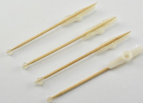 Обратите внимание, что на конце каждой зубочистки оставлена капля клея. Это необходимо, чтобы предотвратить соскальзывание бечевки, когда она будет привязана к концу зубочистки.