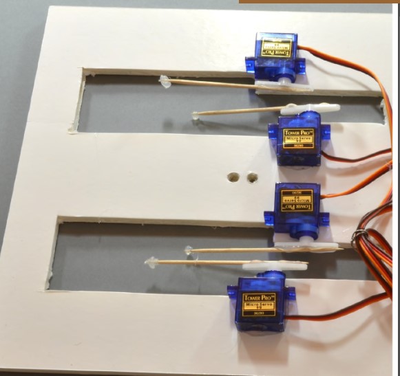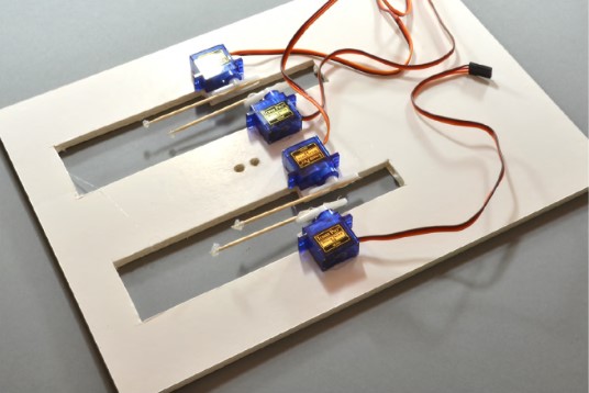 Чтобы управлять движением конечностей куклы, качалки четырех сервоприводов должны иметь возможность свободно двигаться вверх и вниз. Чтобы разместить все на нужных местах, сделаем вырезы на подходящей монтажной панели (хорошо подходит картон для наклейки фотографий).