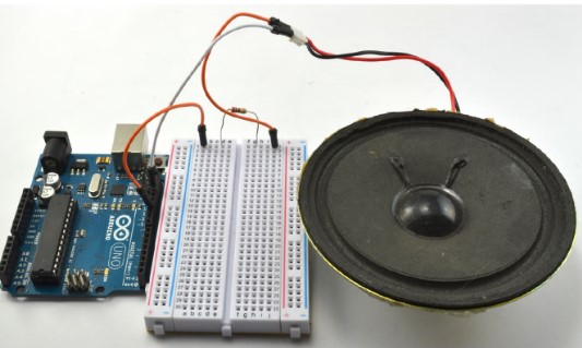 Схема, собранная для проведения эксперимента на макетной плате, показана на рисунке ниже. Один провод от громкоговорителя подключается к контакту GND (заземление) Arduino, а второй - к контакту D11 через резистор.