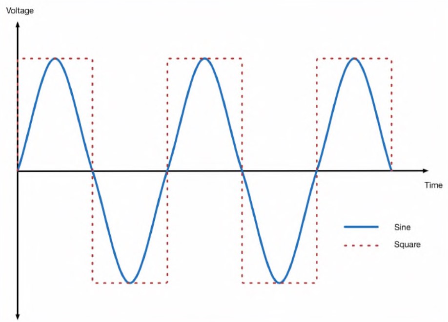 Звук, излучаемый громкоговорителем при подключении его непосредственно к выходному контакту Arduino, режет слух и кажется грубым. Дело в том, что цифровой выход может находиться только во включенном и выключенном состоянии, и звуковая волна, получаемая при этом, по форме напоминает меандр. По сравнению с более мягкой и приближенной к синусоиде звуковой волной музыкального инструмента, звуковая волна в форме меандра считается весьма ненатуральным звуком (рисунок ниже).