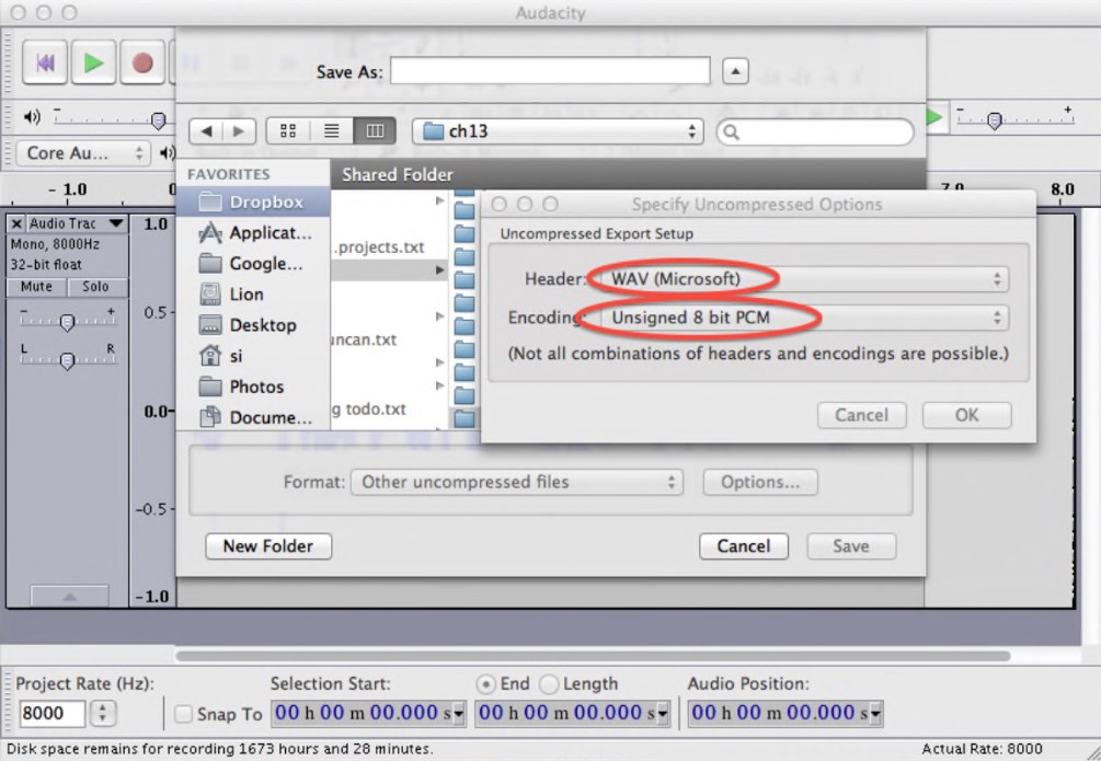 Чтобы создать звуковой файл, запустите программу Audacity, переключите режим записи в моно (Mono) и выберите частоту проекта (Project Rate) равной 8000 Гц.
