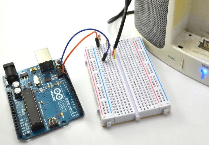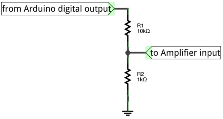 Ток звукового сигнала, исходящего от Arduino, ограничен резистором. Однако напряжение в 5 В, подаваемое на выходной контакт Arduino, слишком высоко для подключения к стандартному входу усилителя звука. Поэтому, когда нам нужно подключить Arduino к звуковым колонкам, чтобы усилить звук, первым шагом должно быть снижение напряжения на выходе.