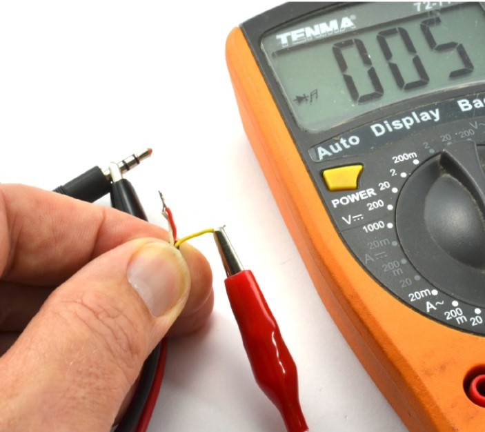 Вам нужно найти только общий (GND) провод, так как провода для левого и правого каналов лучше объединить, чтобы монофонический сигнал от Arduino был слышен в обоих колонках. Общий (GND) провод можно найти с помощью мультиметра, установленного в режим проверки наличия контакта (см. рисунок ниже).
